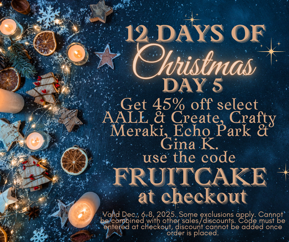 Use the code FRUITCAKE at checkout to get 45% off select AALL & Create, Crafty Meraki, Echo Park and Gina K. But wait, there's more....you'll notice an extra company this morning and make sure to check back later this afternoon for a little peppermint "twist" for the weekend!!