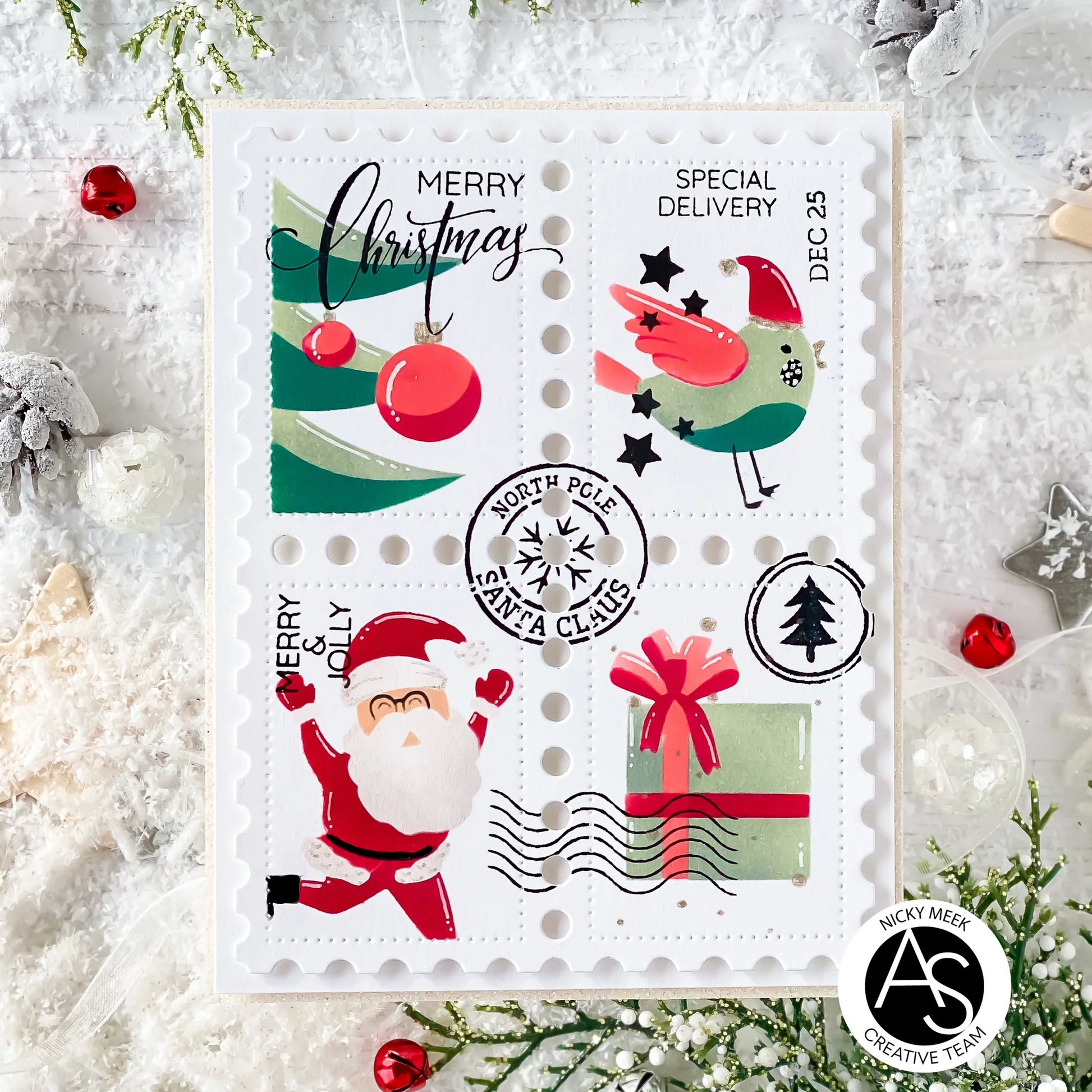 Christmas Postage Stamps Stencil Set (15.2 x 15.2 cm / 6" x 6", 4 layers) by Alex Syberia Designs is designed to coordinate with the Christmas Postage Stamps Stamp Set and the Postage Stamps Cover Die.