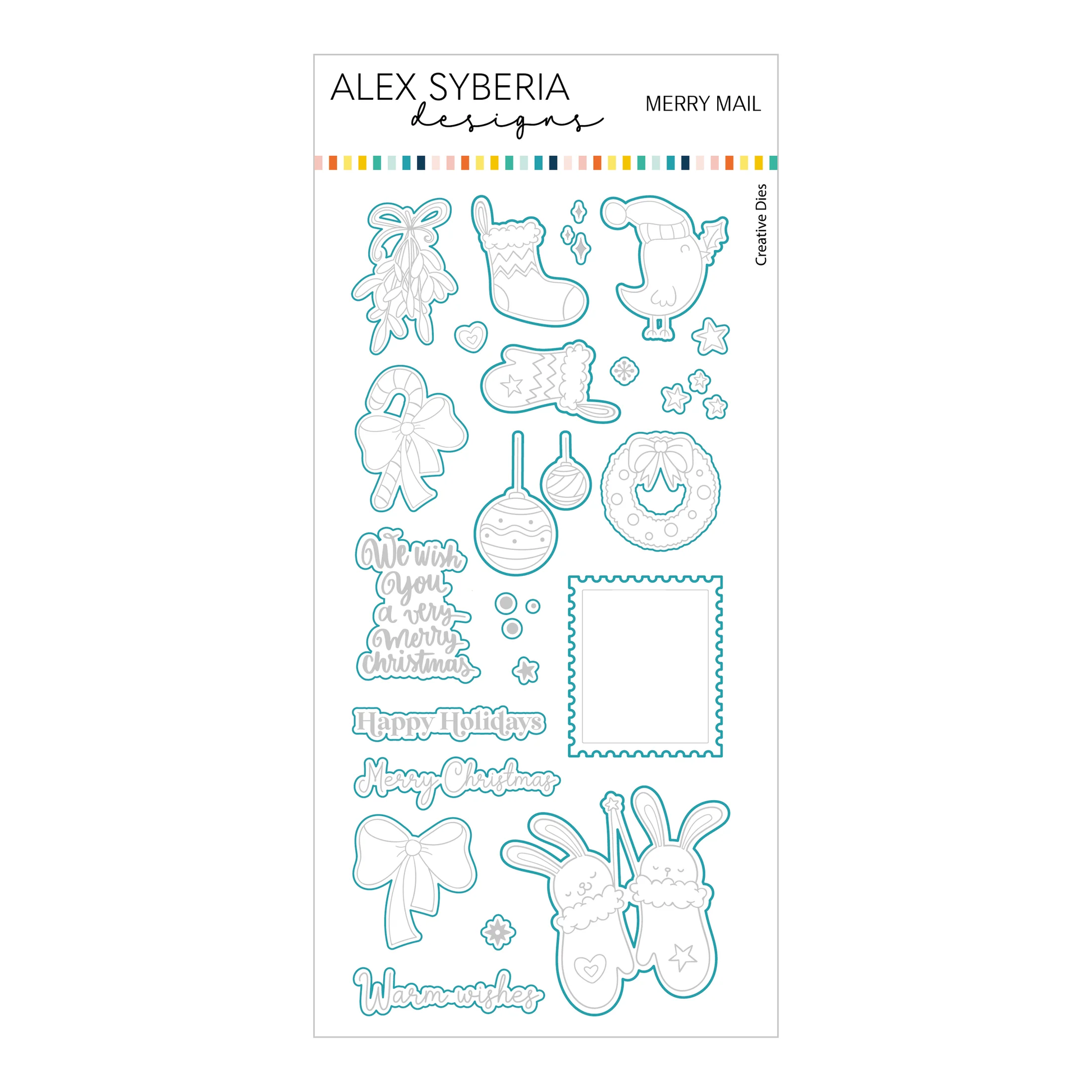 Merry Mail Stamp Set by Alex Syberia Designs (DL / 4" x 8") is a festive clear stamp set filled with holiday icons, sentiments, and cute details. It includes stockings, mittens, ornaments, a wreath, bows, candy canes, mistletoe, stars, and playful greetings – everything you need to create joyful Christmas projects. Includes coordinating dies.