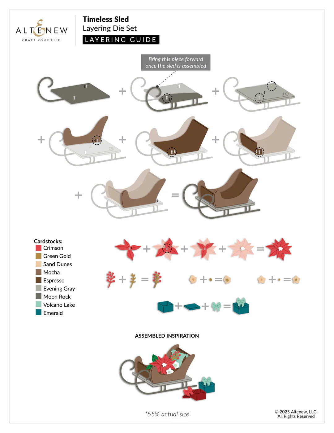 Die Dimensions: Assembled Sled: 3.6" x 2.3" ▪ Poinsettia: 1.2" x 1.0" ▪ Gift Box: 0.7" x 0.6" ▪ Pillow: 1.0" x 0.9"