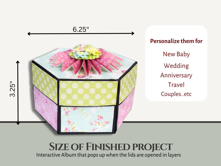 Create Hexagon Explosion Box 6.25” x 6.25” x 3.25” Two Beautiful Scrapbooks Effortlessly! Looking to dive into scrapbooking without the stress of cutting, scoring, and assembling? Our Junk Journal Scrapbooking Kit makes 2 albums and makes the process easy and fun! Save time and focus on the creative side, personalizing your scrapbook albums with any theme you love - whether it’s for a couple, baby, wedding, birthday, anniversary or vacation scrapbook.