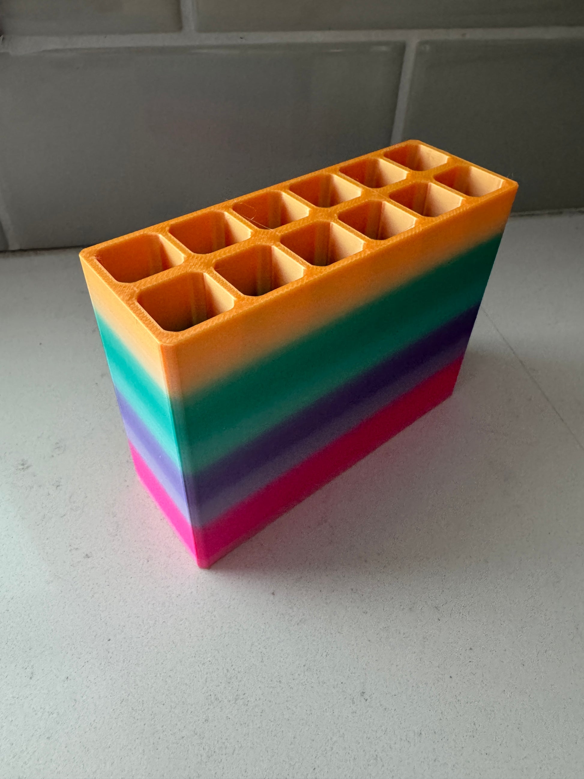 Made to hold your round blending brushes up to 0.5" in size all in one place, ready to go and out from under the crafty chaos of your desk. Holds 12 brushes.
