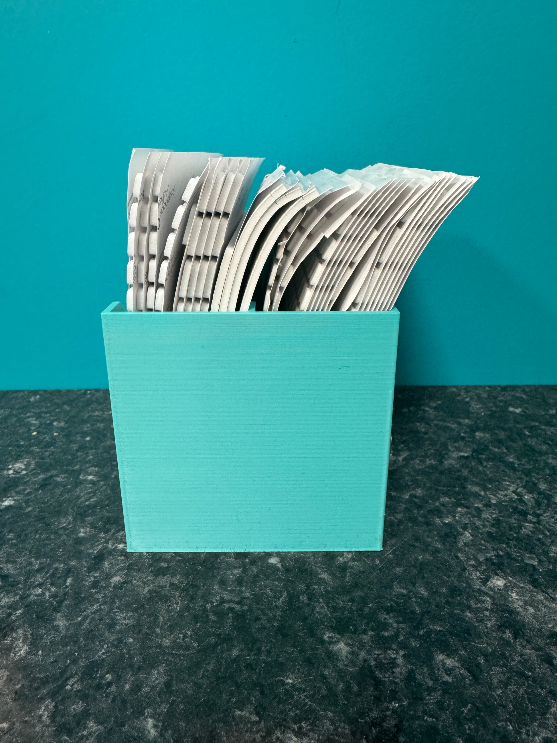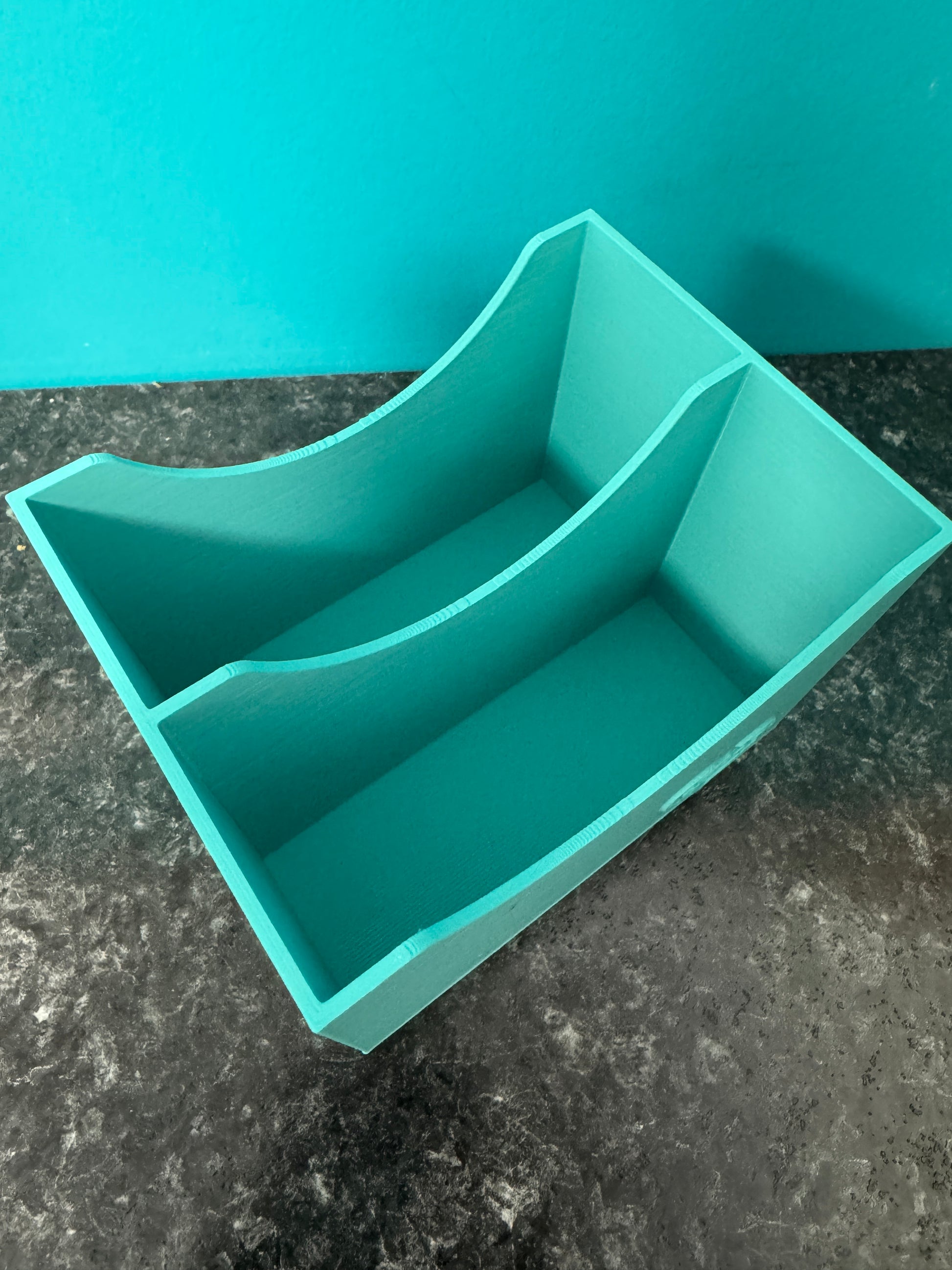 Measures 4.5"x3 3/8"x3 3/8". Each inner slot can hold items that measures up 4.25"x1.5".