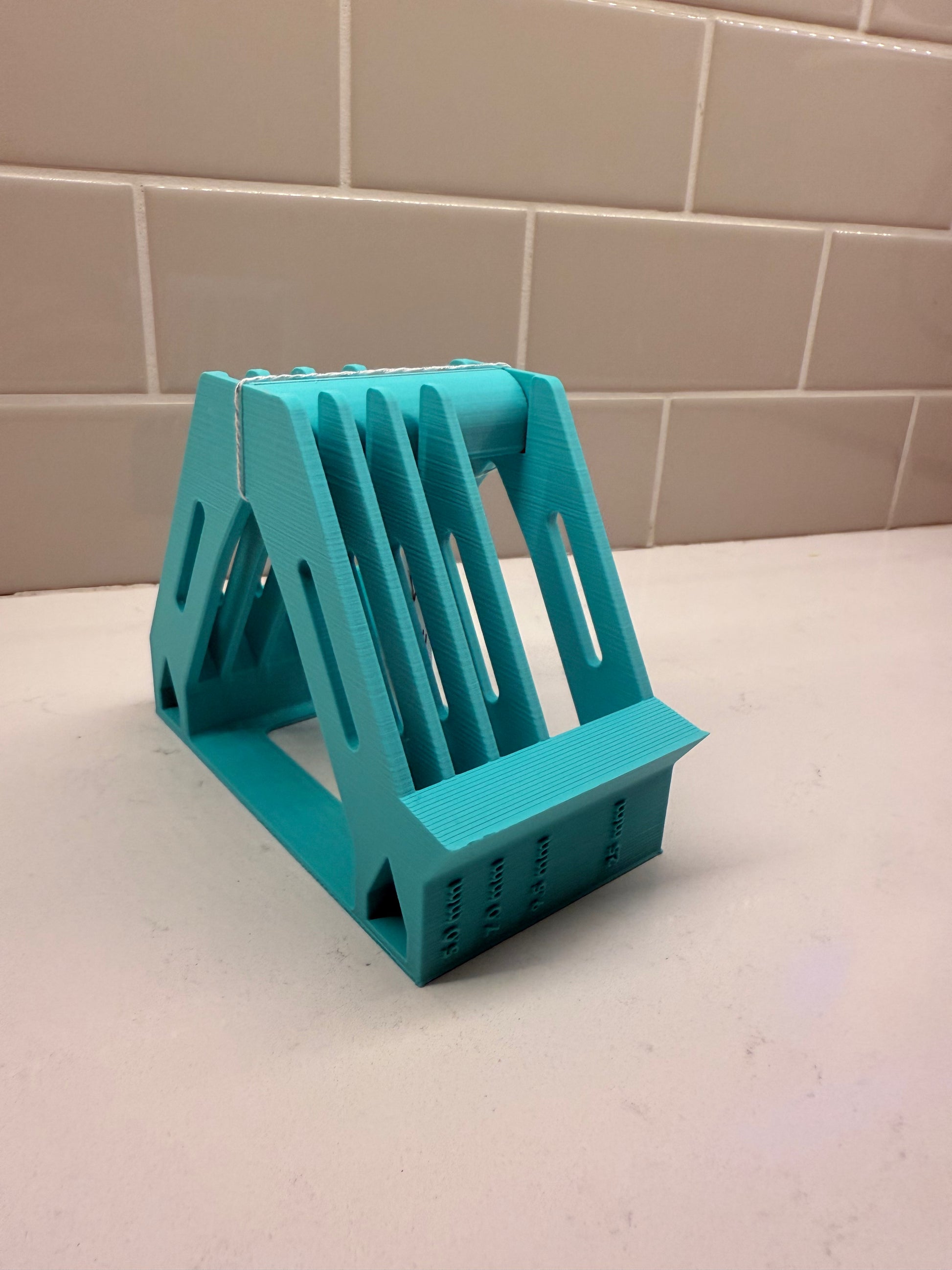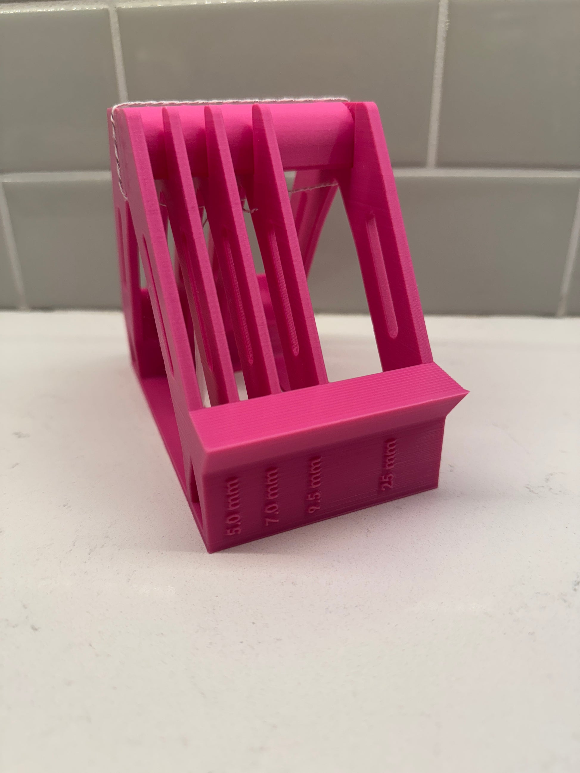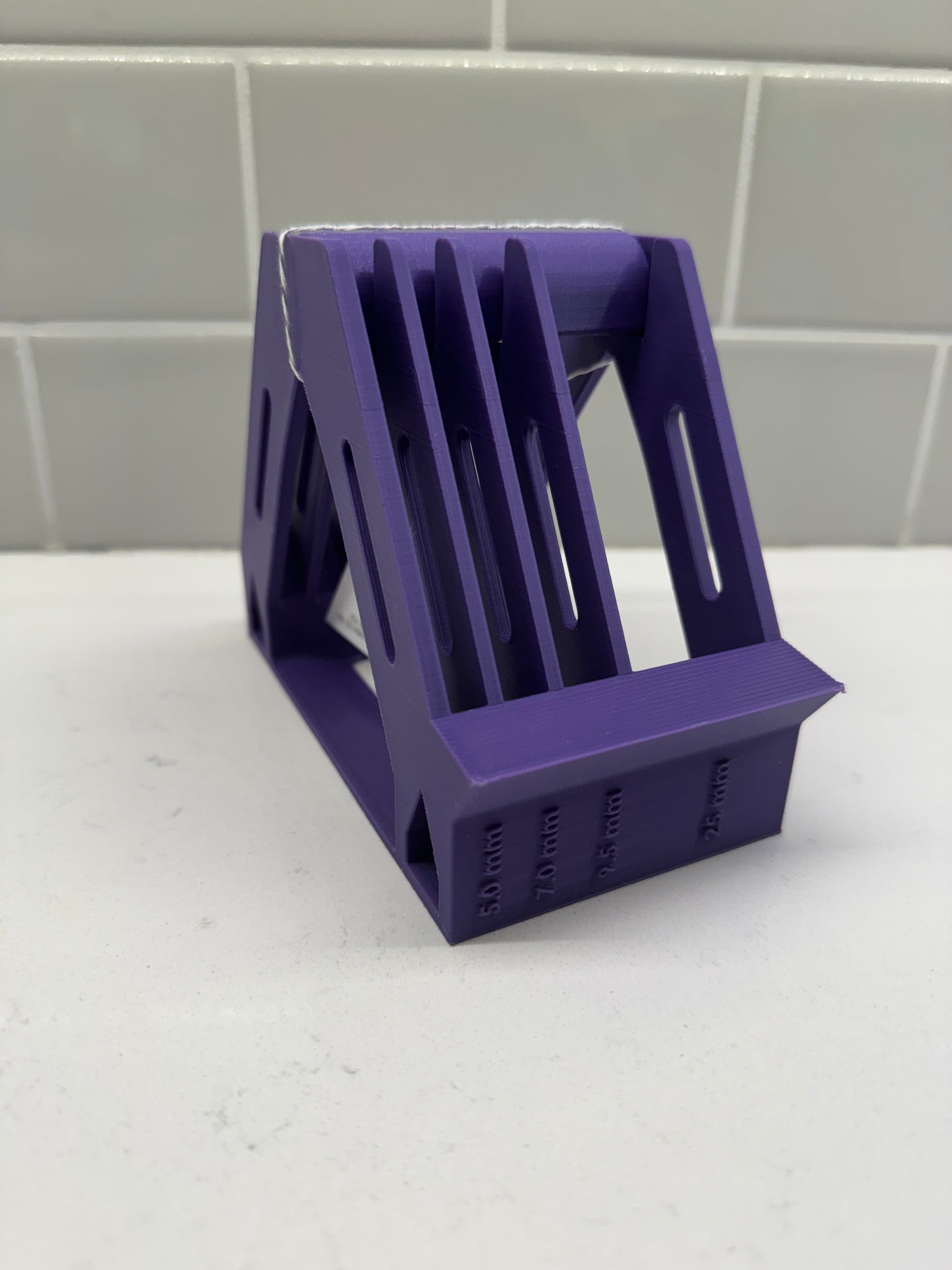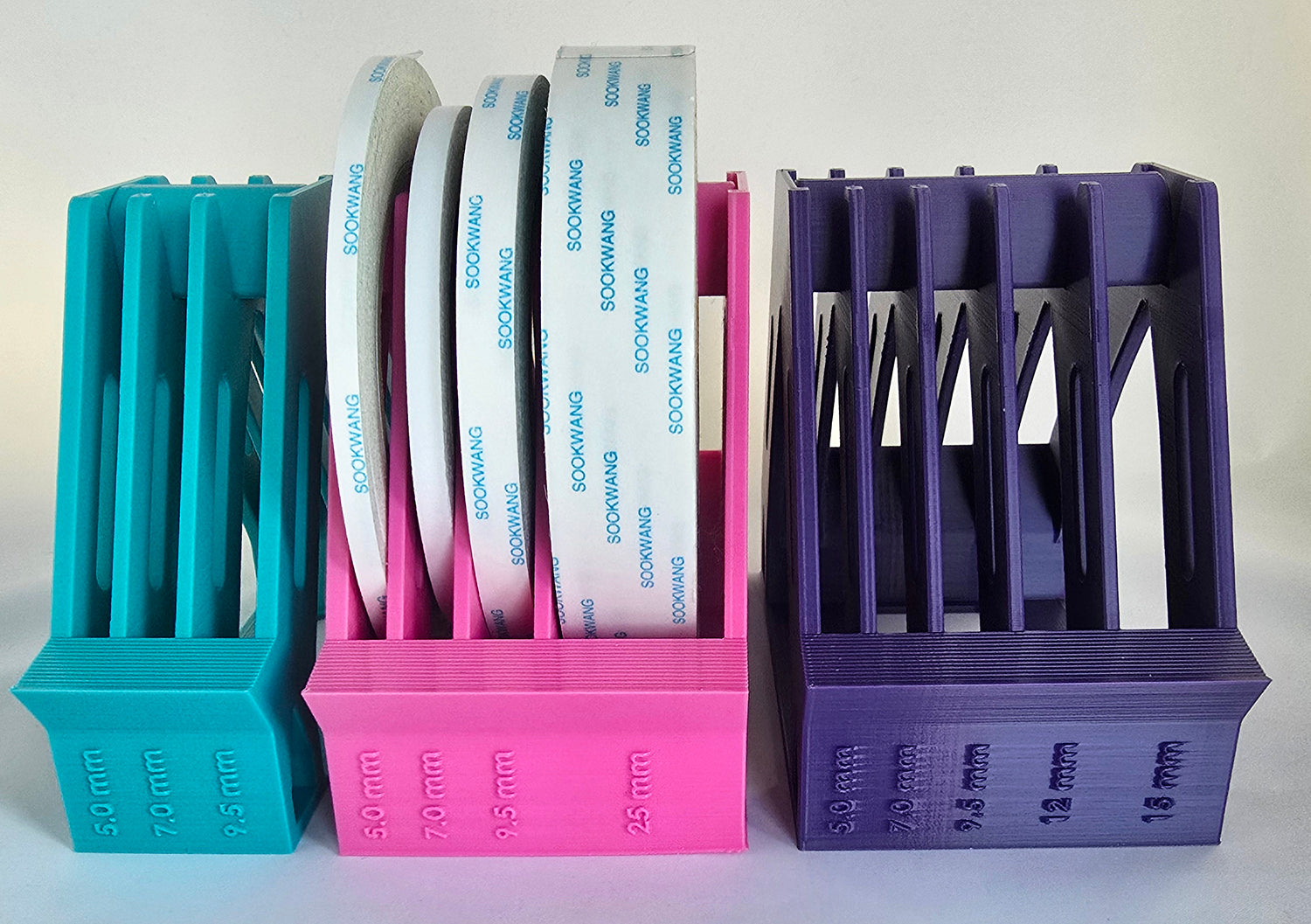 Holds 5mm, 7mm, 9.5mm and 25mm rolls of tape. If you don't use 25mm tape, you can put a few different sizes there instead.