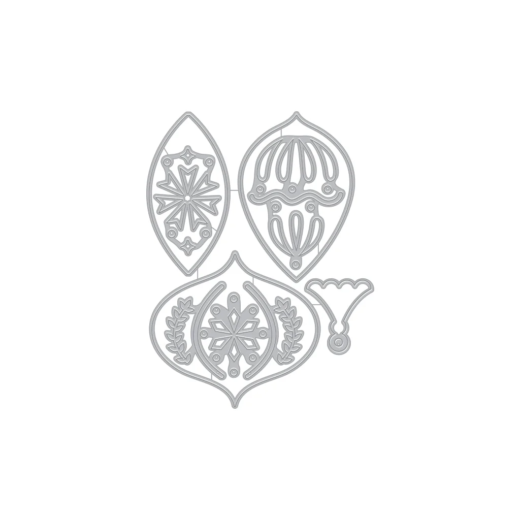 This seven piece set of dies combines to create three beautiful holiday ornaments. Use the outer die alone for a solid ornament, or combine with the inner pieces to add intricate designs. The seventh die adds the perfect topper to your ornament creations.