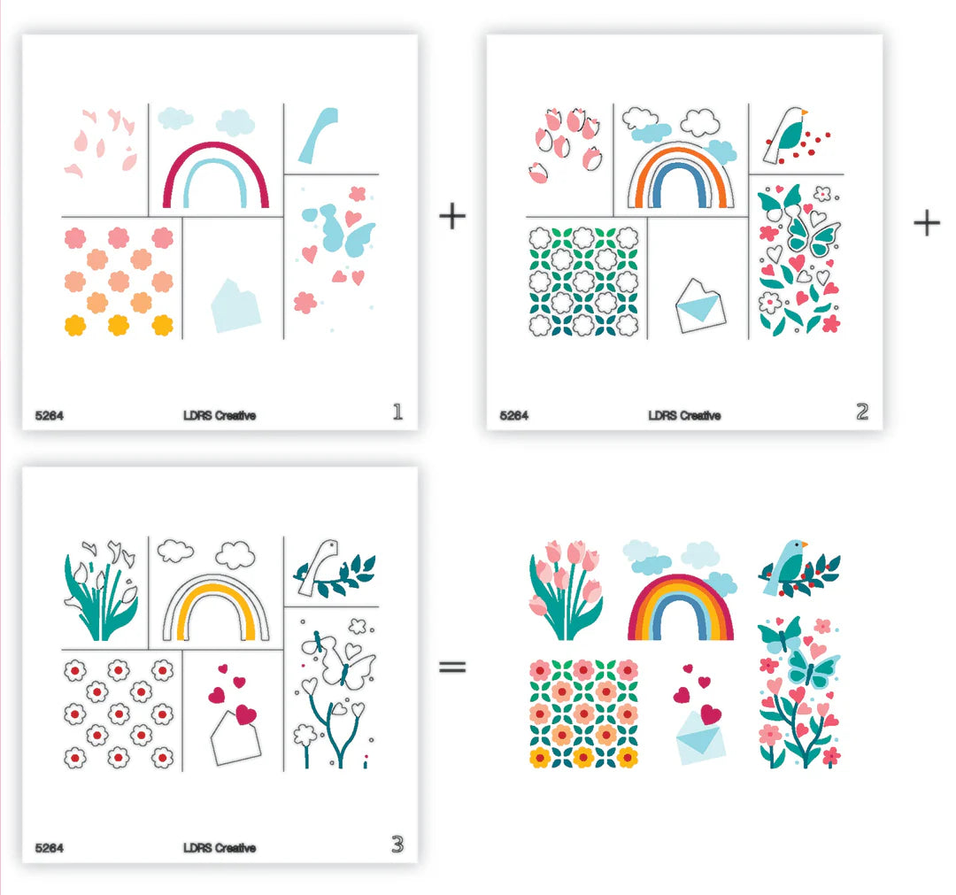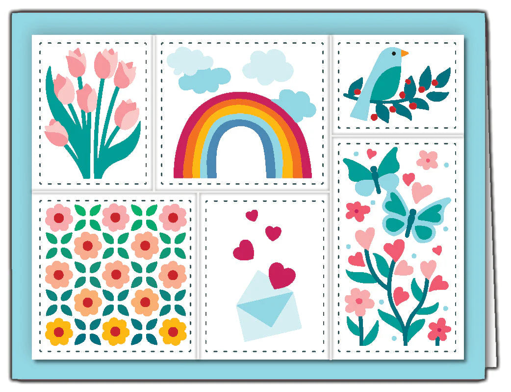 Create miniature stenciled scenes in a snap! These stencils line up with the Nested Postage Collage Dies (8484) and allow you to send sunny greetings all year long. Grab your inks and bring flowers, butterflies, rainbows, and more to life! Add in elements from our line of postage collage stamps to help create a beautiful postage collage project.