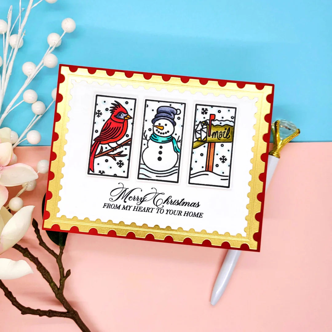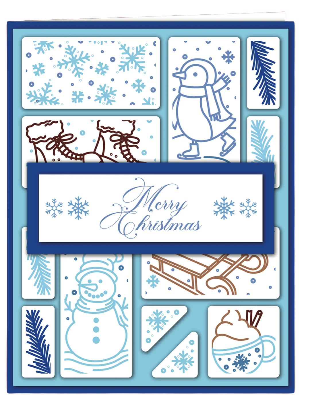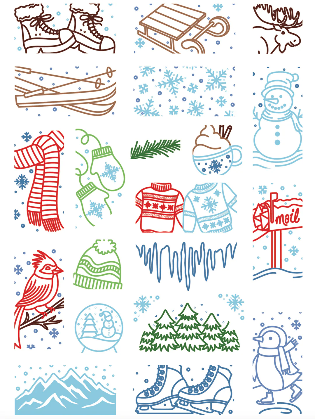 Celebrate the magic of snowy days with our beloved Puzzle Scenes - now with a frosty twist! This new 6x8 stamp set features lots of winter images and icons like mittens, a snow globe, snow capped mountains, boots, skis, a cardinal, and more. Stamp colored images for quick, no-color projects, or stamp in black and add your own colorful touches with markers or pencils. Designed to fit perfectly within the grid lines of the Puzzle Frames 6x8 Stamps (3524), these scenes make creating winter wonderland cards a breeze!