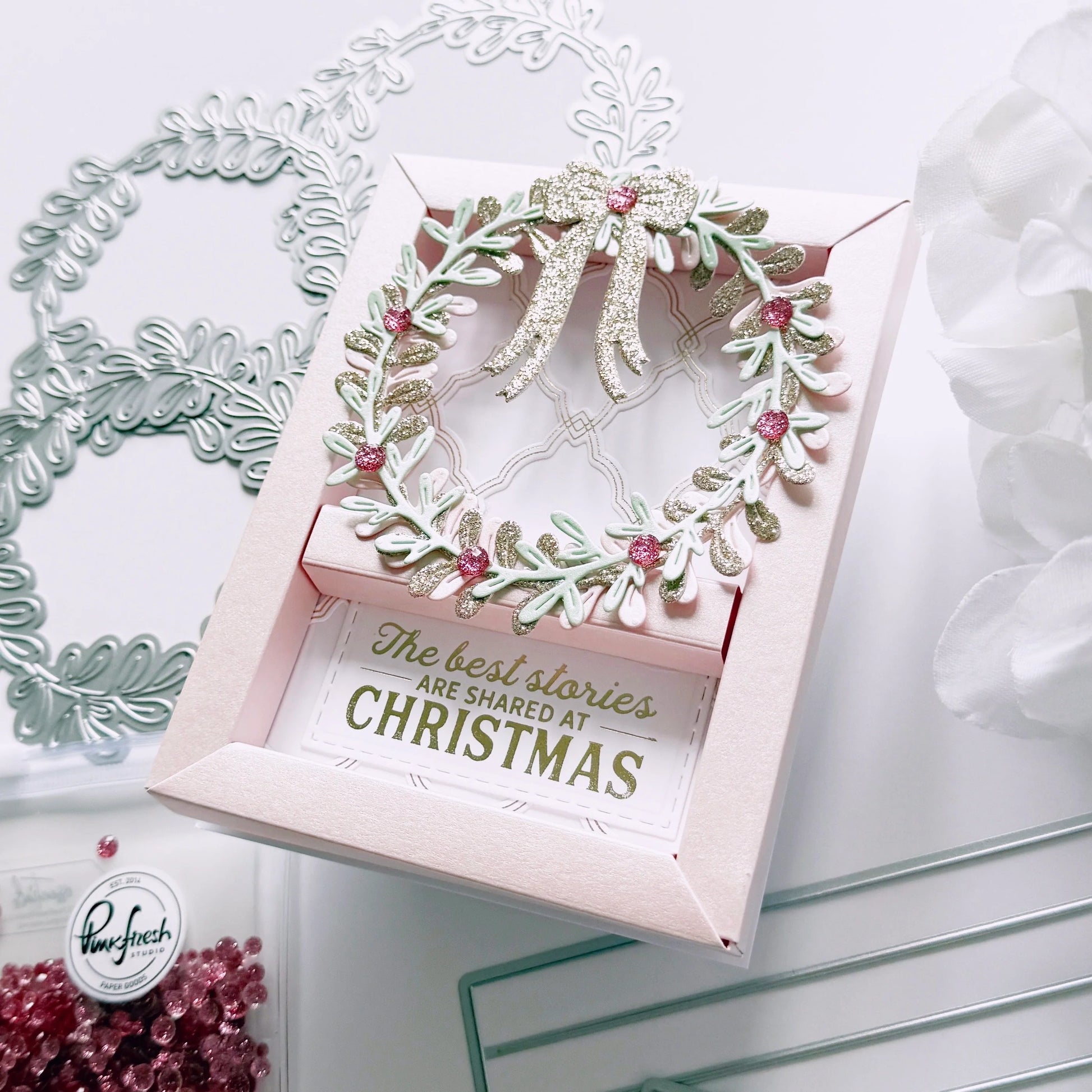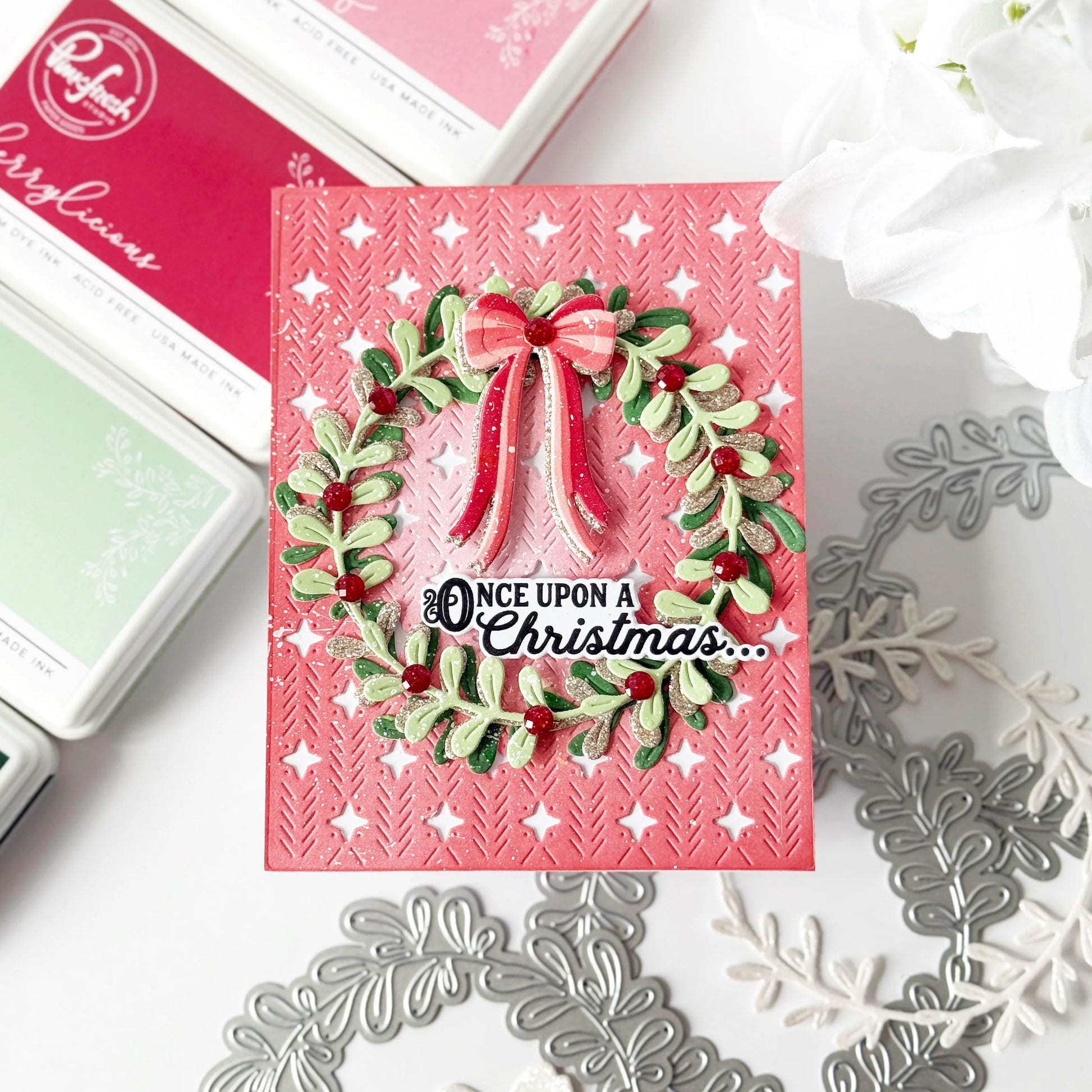 Add festive elegance to your cards with Tied with Cheer, designed by Inna Moreva. This lush 3-layer wreath, adorned with a ribbon bow, brings timeless holiday charm to cards. Layer in rich greens, shimmering golds, or frosty pastels for custom seasonal styles. This unique bundle pairs a 4-piece die and a single stencil that, when combined, make a gorgeous, dimensional wreath worthy of hanging on your yearly Christmas cards.