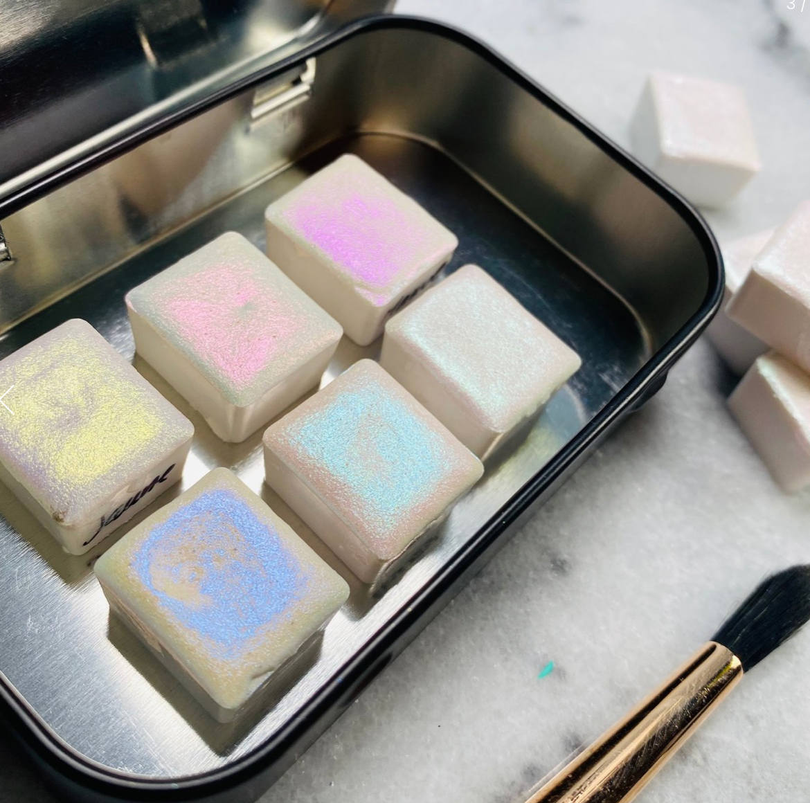 As the base of their recipe is white, these iridescent watercolors can create a subtle pearlescent effect when applied to regular paper. By changing the angle of the light, the iridescent color will magically become visible for a guaranteed surprise effect!
