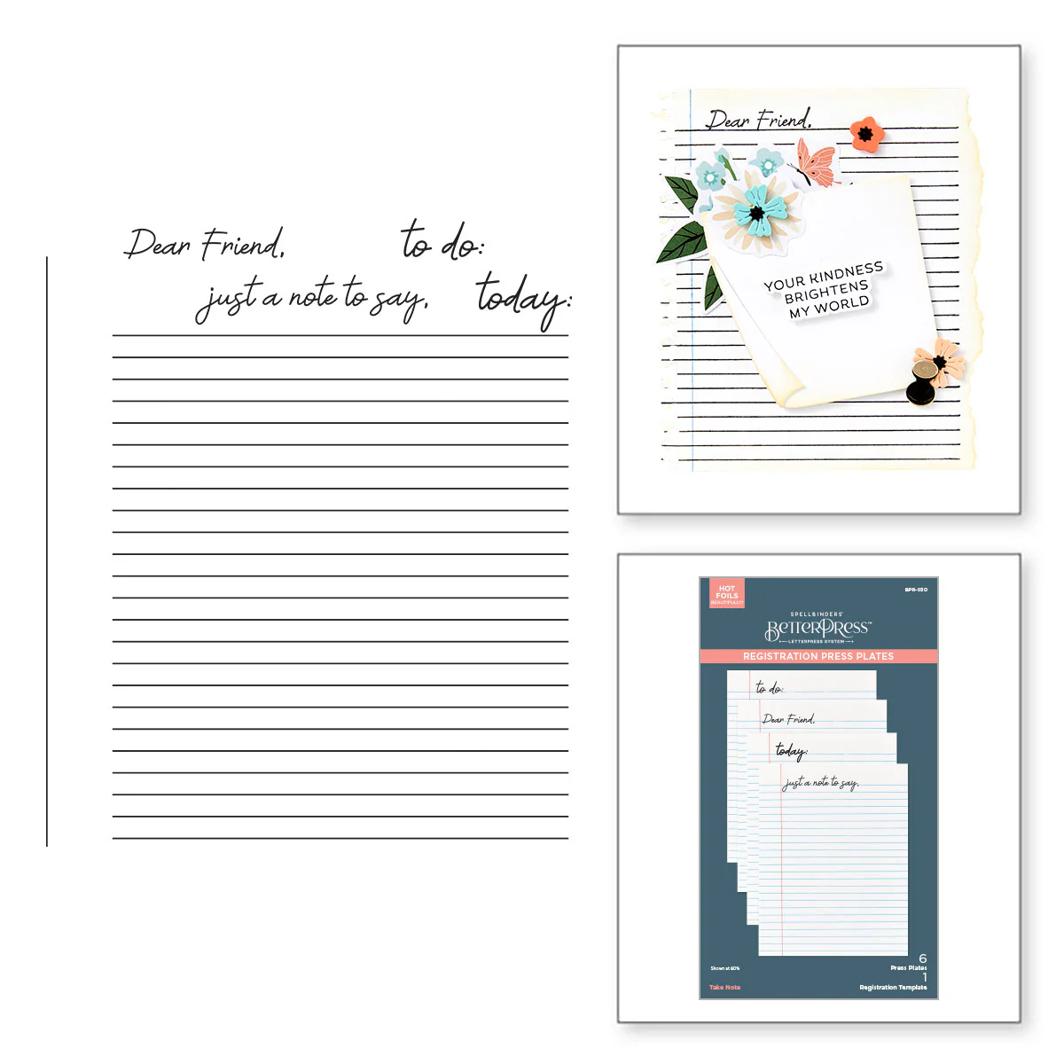 Take Note Registration BetterPress Plates are from the Take Note Collection. The set of six press plates and mylar printed registration template come together to help you create a classic notebook page design. There are four sentiments to personalize: Dear Friend, Just a Note to Say, To Do and Today. What a fun way to capture memories for journaling, or for a unique background on a card!
