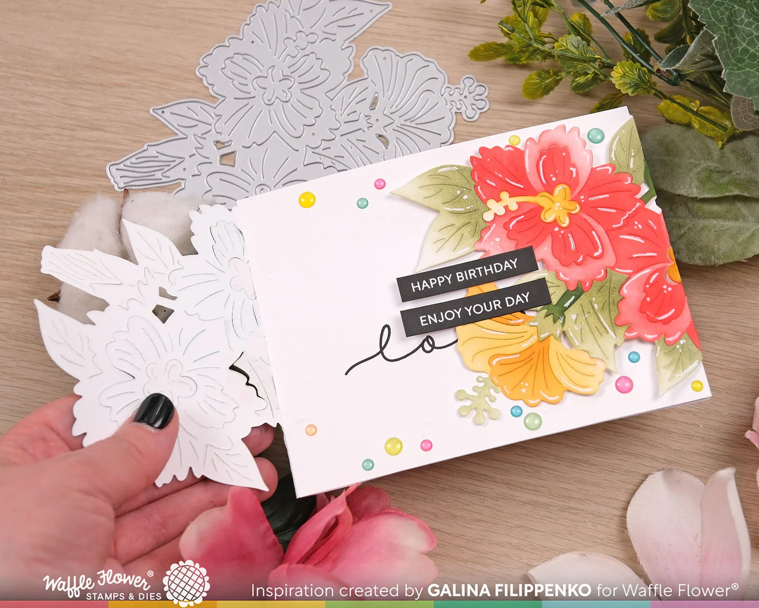 Note: The mask layer for the bottom flower center may lift while ink blending the petals—but don’t worry! The separate die-cut flower center is designed to cover that area perfectly.