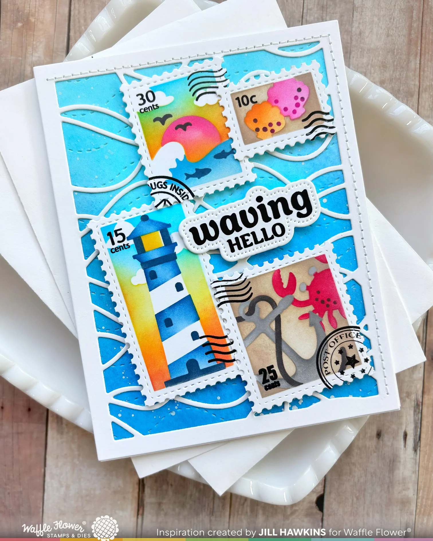 Like the rest of our Postage Collage™ themed stencil line, this Coastal stencil works with both the original Postage Collage Die and the Blocks Die. Use it with the panel die for a postage stamp look, or with the blocks die for a framed layout or shaker windows.
