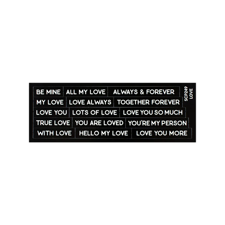 Add the perfect Love sentiment to your cards with this subsentiments diecut sheet. This sheet includes 15 sentiment strips in 1/4" increment in width.